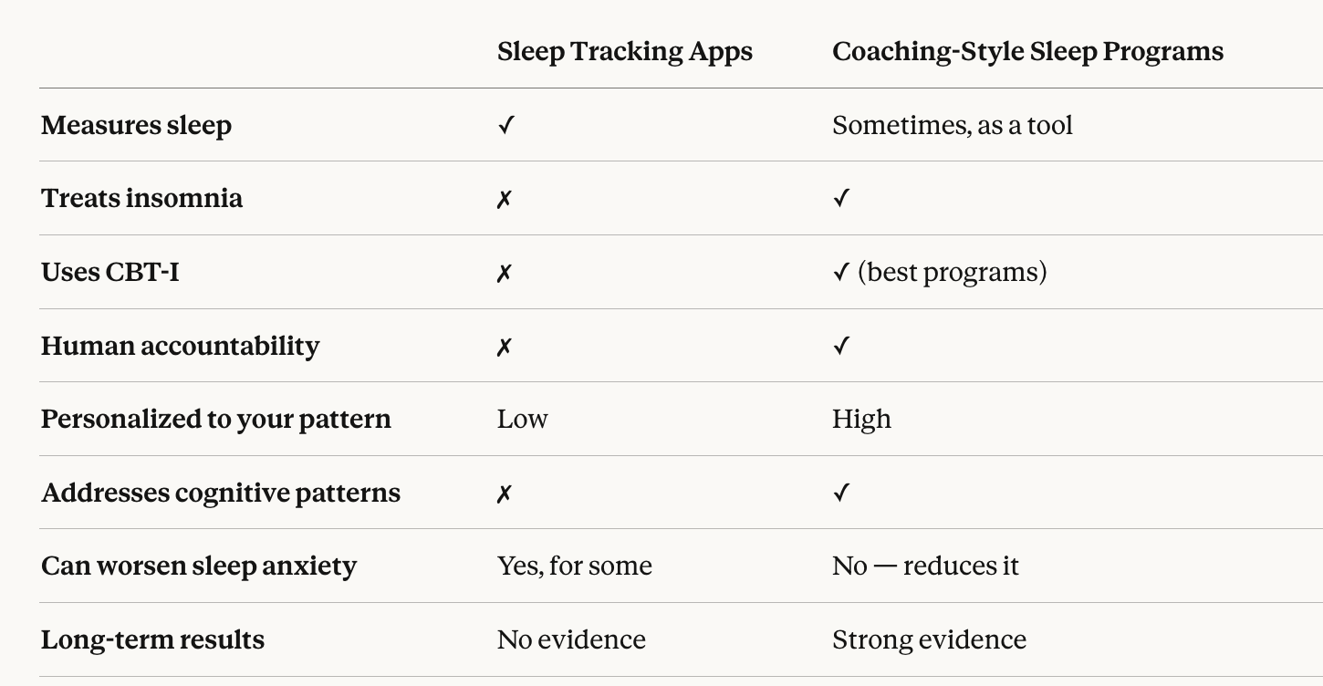 Sleep tracking apps and coaching-style sleep programs are not competing versions of the same thing — they're fundamentally different tools solving different problems. Tracking measures sleep. Coaching programs change it. For anyone dealing with chronic insomnia, the choice between them isn't really a choice at all.