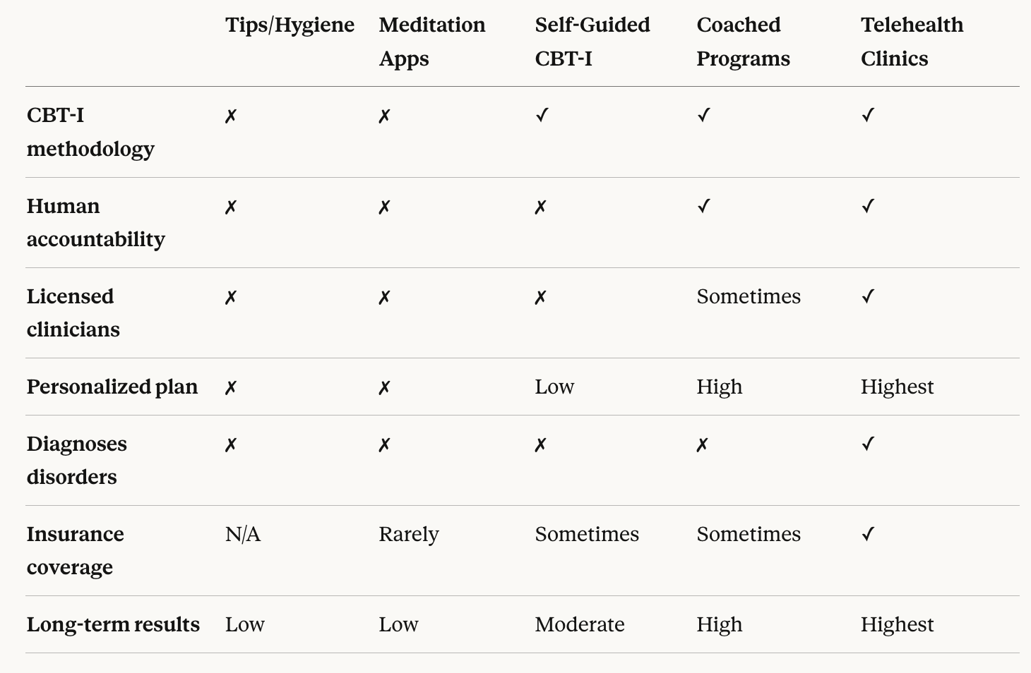 Not all sleep programs are equal — and the gap between a tip list and a properly structured, clinician-guided CBT-I program is not a small one. It's the difference between managing insomnia indefinitely and actually resolving it.